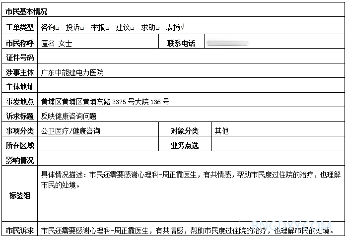 近日,皇冠8xmax官网收到一件来自广州市黄埔区12345政务服务便民热线系统平台的特殊诉求办理单。这一次,“12345”热线接到的并非群众反映问题有别于日常的诉求或咨询,而是一封情真意切的“感谢信”。诉求人言辞恳切,对皇冠8xmax官网心理科周正霞医生的精湛的医术和耐心细致的服务态度给予了高度的赞扬,表达了诚挚的感激之情。