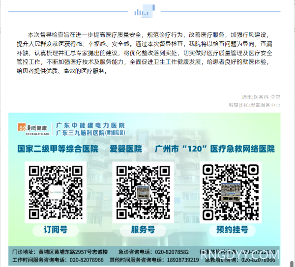 本院动态 联系电话:020-82078966 邮箱:rngd@crmedical.hk 【QQ咨询】: 本院动态 | 黄埔区卫生健康局组织专家组莅临皇冠8xmax官网开展2024年度医疗医疗服务和医疗质量工作督导检查 时间:2024-11-23 编辑:皇冠8xmax官网 阅读:42 上一篇:本院动态 | 电力医院开展消防知识宣讲会和消防安全应急演练 下一篇:谈判采购公告 | 皇冠8xmax官网住院部2号楼4层儿少心理病区装修改造设计服务采购项目谈判采购公告 我要评论: 相关报道: 安全生产月 | 牢安全防线 守护医患平安—皇冠8xmax官网召开2025年安全生产月启动会议 谈判采购公告 | 皇冠8xmax官网住院部2号楼4层儿少心理病区装修改造设计服务采购项目谈判采购公告 端午安康 | 粽叶飘香时,医患情更浓 润心科普 | 心如明镜语难言?有一种“有苦说不出”叫“运动性(Broca)失语” 规范·融合·创新 | 皇冠8xmax官网慢性肾脏病患者综合管理理念研讨会圆满召开 偏头痛关爱月 | 电力医院到黄埔街道港湾机关村社区开展“中国偏头痛关爱月”主题综合义诊活动 润心科普 | 血管"堵"命危机:你的生命通道正在报警! 全民营养周 | 骨折后进食有讲究 地址:广州市黄埔区黄埔东路2957号志诚楼(门诊部) 黄埔东路3375号大院(住院部) 咨询:020-82078966 邮箱:rngd@crmedical.hk 传真:86(020) 82078027 患者服务小程序 官方订阅号 Copyright 2025 皇冠8xmax官网版权所有 粤ICP备20049783号 服务性质:非营利性网站 粤公网安备 号